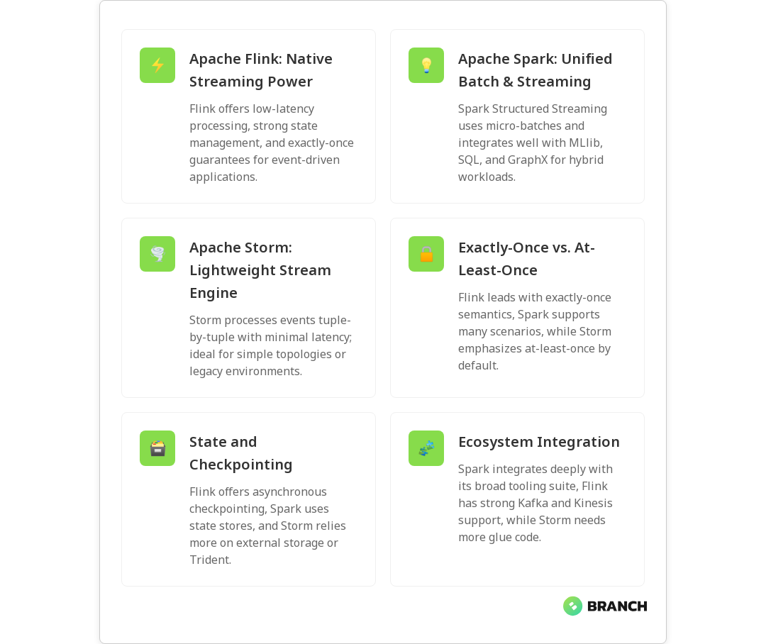 - Pick Spark when you want one engine for both batch and streaming, need easy access to Spark’s ML and SQL ecosystem, and can tolerate micro-batch latencies (tens to hundreds of milliseconds or more).