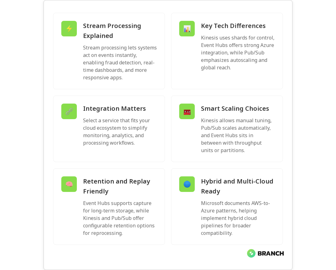 - Integrations & ecosystem: Kinesis is native to AWS services; Event Hubs plugs into Azure analytics and real-time intelligence features (see Microsoft’s comparison of Azure Real-Time Intelligence and comparable solutions); Pub/Sub is tightly coupled with Google Cloud services like Dataflow.
