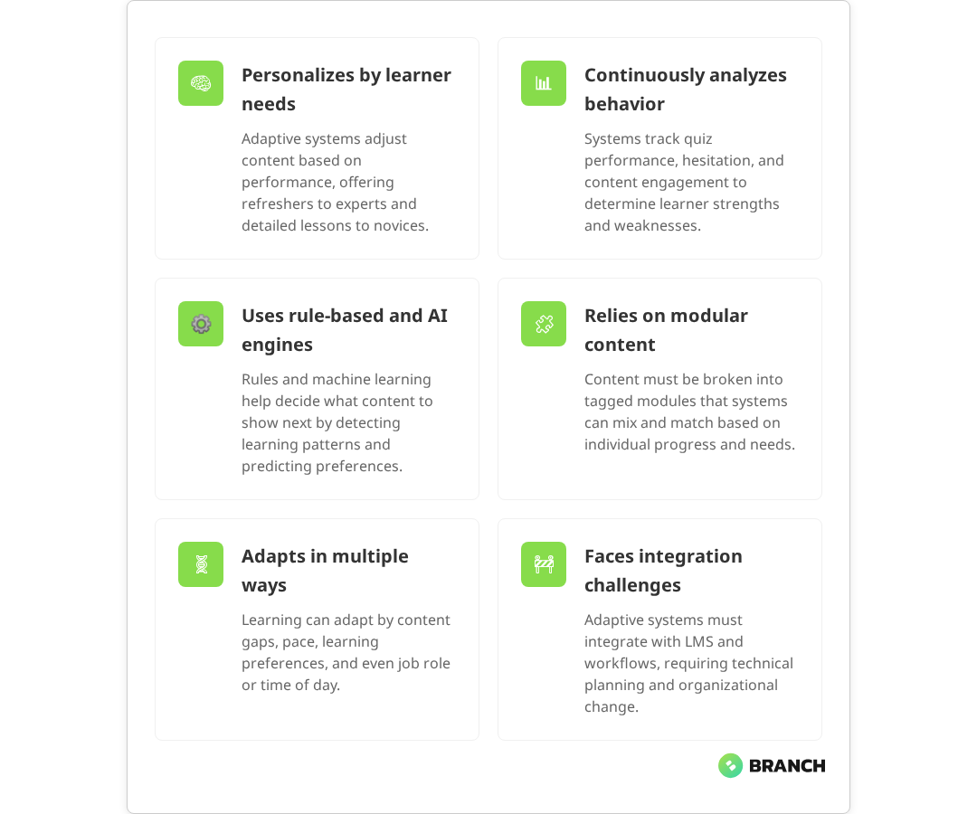 Picture this: two employees are taking the same compliance training. One is a seasoned manager who just needs a quick refresher on updated policies, while the other is a new hire who needs comprehensive coverage of every detail. Traditional eLearning serves them identical content at identical pacing. Adaptive learning, on the other hand, recognizes their different needs and adjusts accordingly delivering targeted refreshers to the manager while providing detailed explanations and additional practice opportunities to the newcomer.