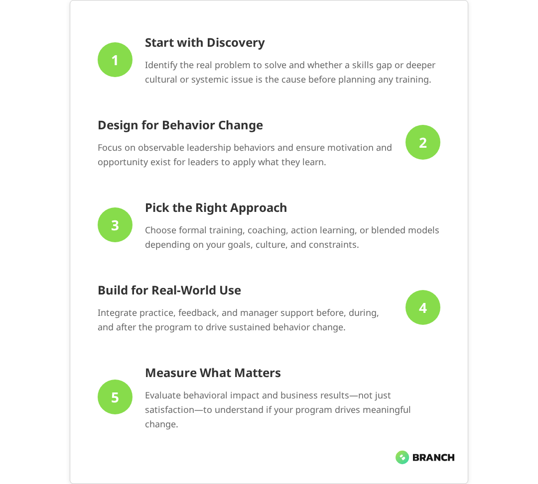 - Provide practical tools: Templates, frameworks, and job aids that leaders can use immediately