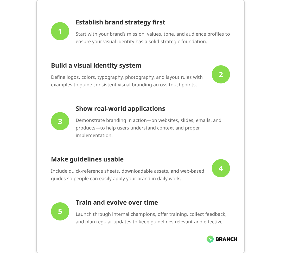 A team like Branch Boston can help bridge the gap between brand strategy and practical implementation, ensuring your guidelines work for both your brand vision and your team’s real-world needs.
