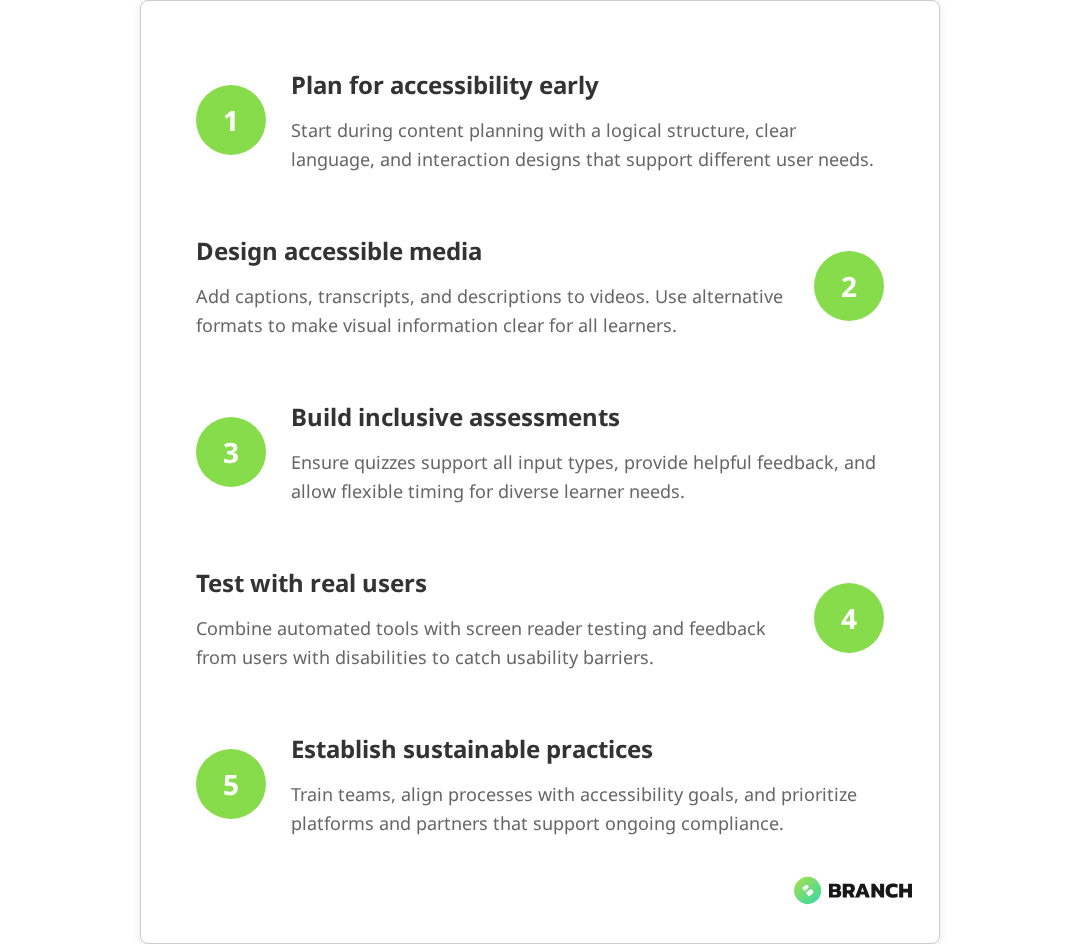 Making eLearning accessible requires weaving WCAG principles into every stage of content development, from initial design to final testing. Here’s how to build accessibility into your workflow: