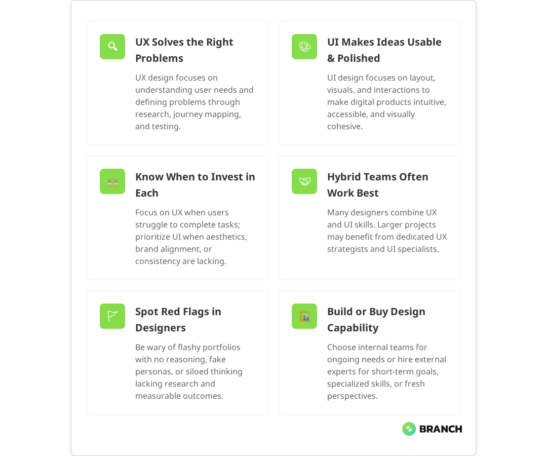 The key insight? Role labels matter less than actual competencies. When you’re evaluating design talent or agencies, focus on their ability to explain the reasoning behind their decisions, whether that’s user research methodology or visual design choices.