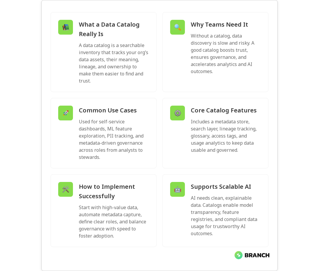 When a catalog is well-adopted, it reduces duplicated work (no more “golden table” copy created by a desperate analyst), improves reproducibility, and increases trust in analytics outputs.