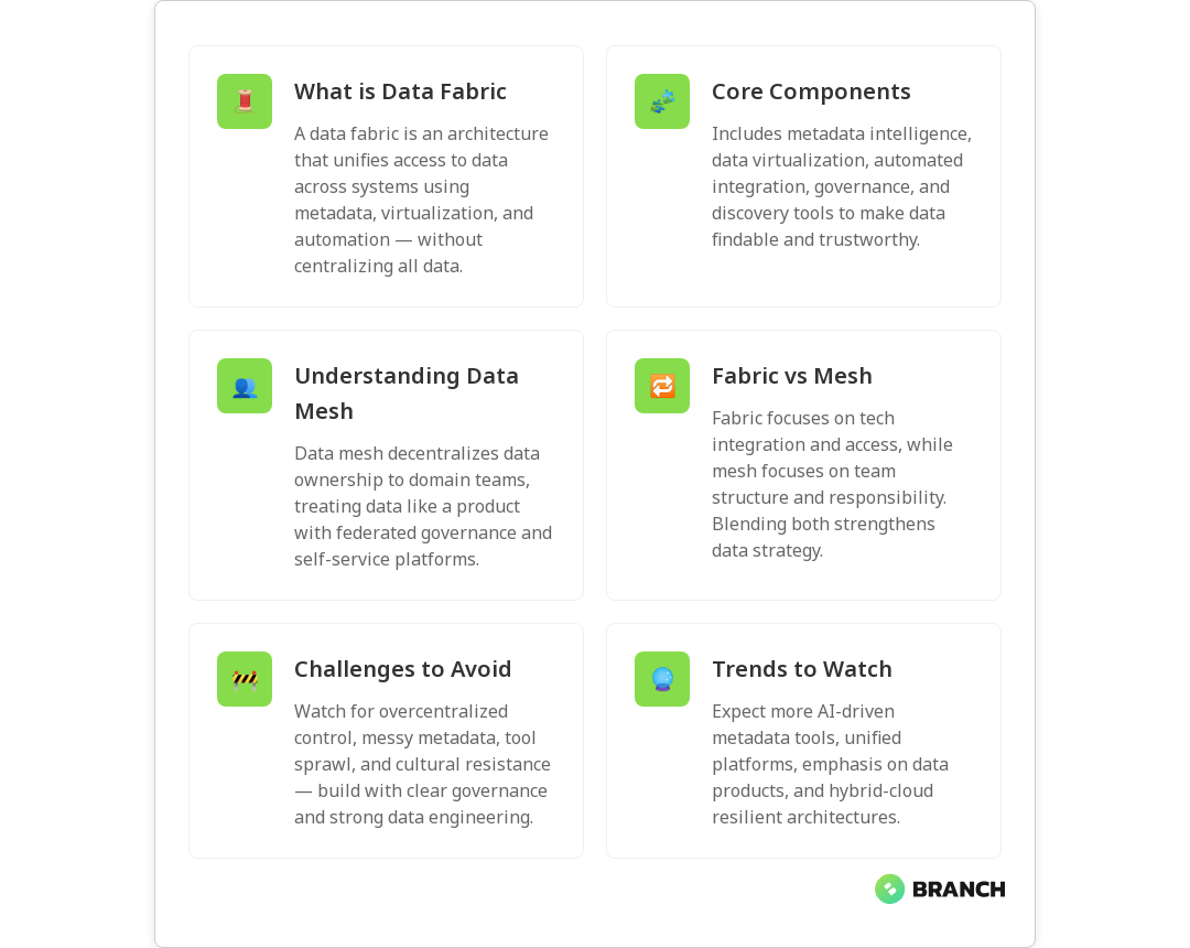 - Poor metadata hygiene: Fabric depends on accurate metadata. Invest in cataloging, lineage, and automated metadata capture from day one.