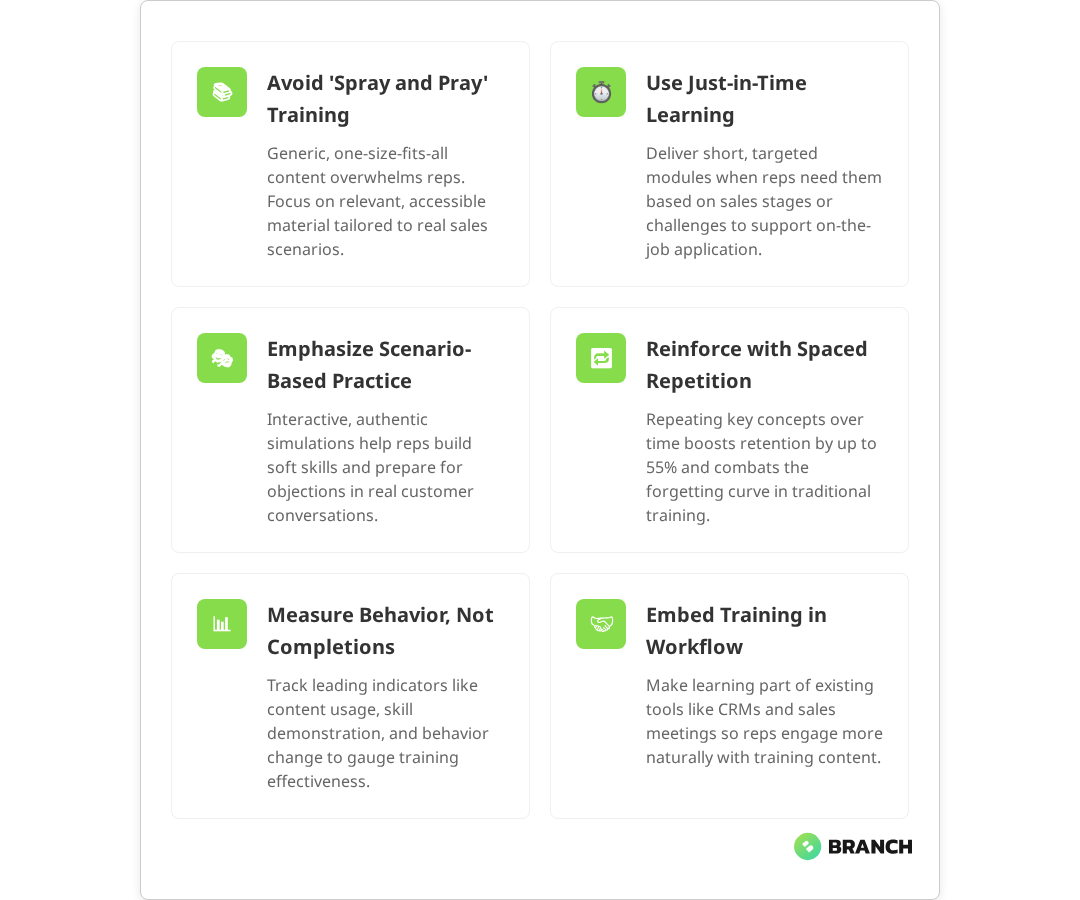 A team like Branch Boston brings together strategy, design, and engineering capabilities to create learning experiences that are both pedagogically sound and technically robust. We understand that effective sales enablement isn’t just about content creation—it’s about building systems that drive sustainable behavior change.