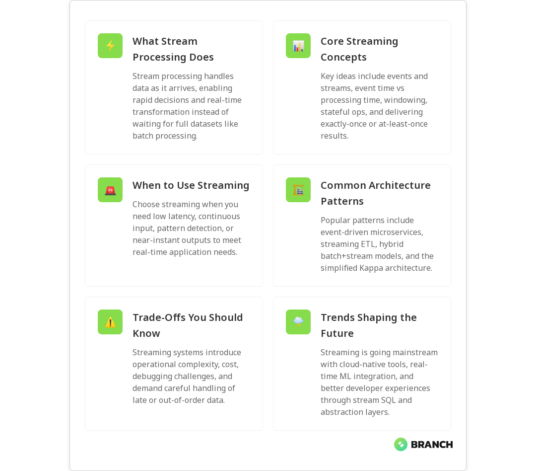 - Events and streams: A stream is an append-only sequence of events (user clicks, sensor readings, log lines). Processing happens continuously as events arrive.